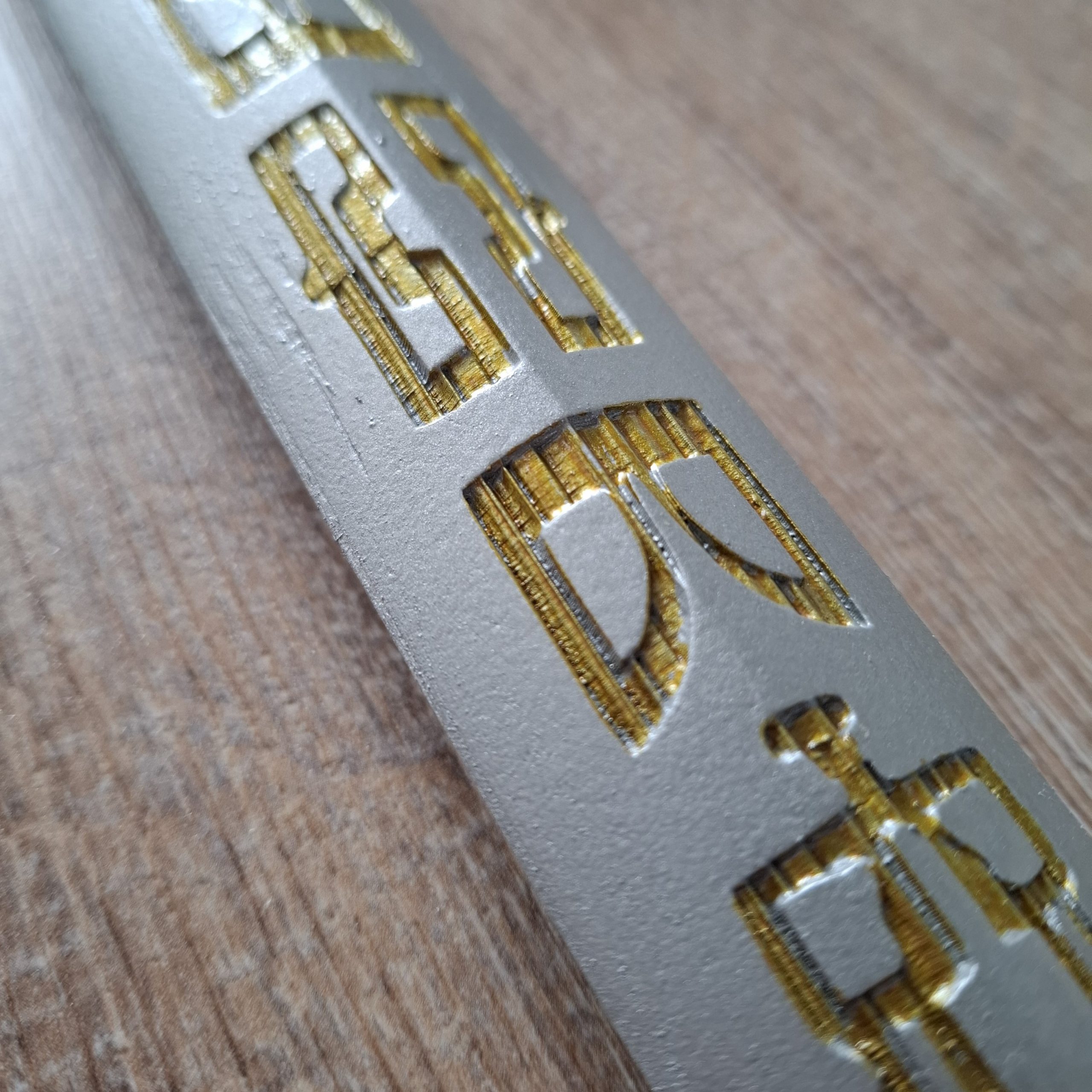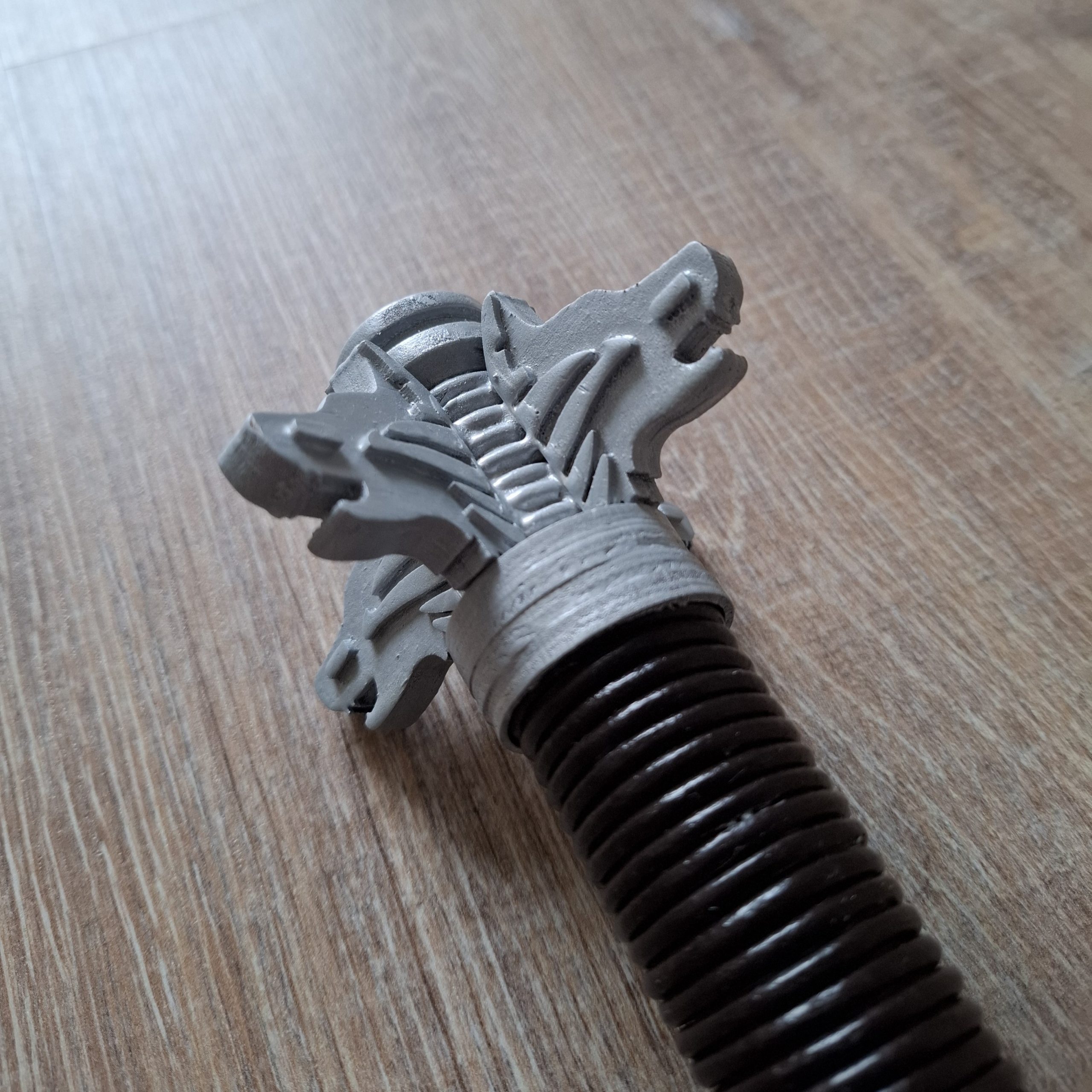 Für die präzise Darstellung der Details zog Sie mich nun hinzu. So wurden die Wolfsköpfe (am Ende des Griffs) mithilfe einer selbsterstellten Vorlage ausgeschnitten, anschließend montiert und lackiert.