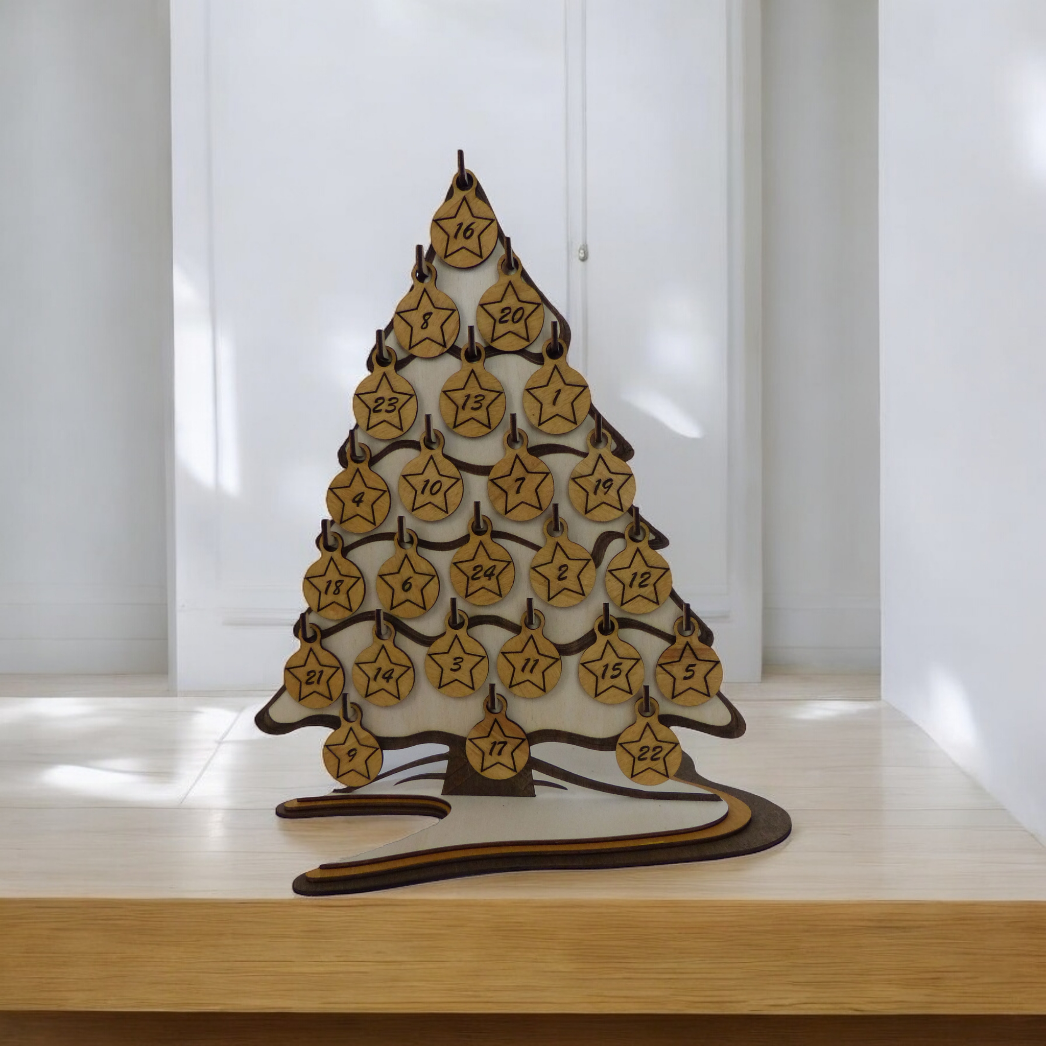 Dieser Adventskalender wurde vollständig aus Holz gelasert und die Bestandteile anschließend geklebt. Während sich auf der Vorderseite der Türchen wie gewohnt Zahlen befinden, sind die Rückseiten mit 24 witzigen Zahnarzt-Sprüchen versehen und erinnern mit ihrer Form an Christbaumkugeln.