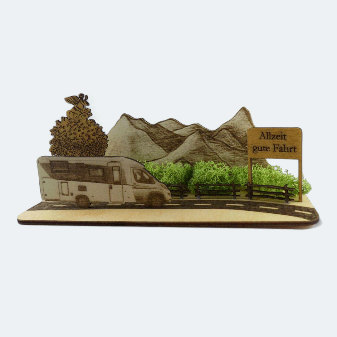 Insgesamt fasst das Modell 10 x 19,5 x 8,5 cm, besteht vollständig aus verschiedenfarbig lasiertem Holz und Kunstpflanzen.